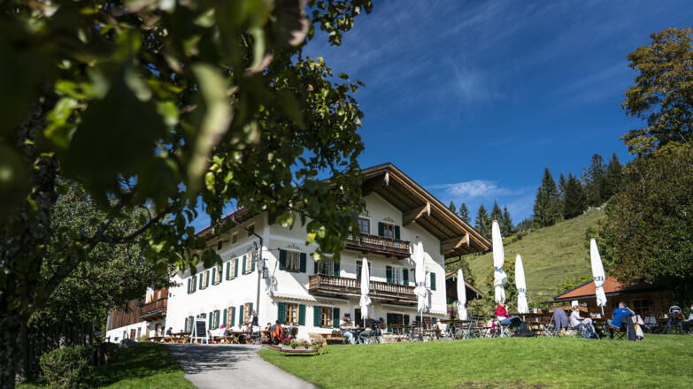 Die Tour beginnt in Bayrischzell an der Kuranlage. Wir folgen dem Lauf des Gangelbaches aufwärts bis zur Schönbornkapelle. Vor der Kapelle biegen wir links auf den asphaltierten Wendelsteinweg ein und folgen ihm etwa 300 Meter bergauf. Danach biegen wir erneut links ab. Der Wanderweg führt uns leicht ansteigend einige hundert Meter unterhalb der Alpenstraße entlang, bis er links abzweigt. Bergab wandern wir jetzt bis zum Bachbett des Wendelsteinbaches. Bei der Grünen Gumpe wandern wir über einen Steg und dann wieder durch Wald und Wiesen bis zu den Bergbauernhöfen auf dem Hochkreuth. Der Weg dorthin steigt stetig an, ist aber nicht steil. Einer der Höfe ist der „Siglhof“. Er ist jeweils von Mitte Mai bis Oktober bewirtschaftet. Wir können uns hier mit einer kleinen Brotzeit, Getränken, Kaffee und Kuchen stärken und die herrliche Ruhe genießen. Von Hochkreuth aus erreichen wir in einer halben Stunde Osterhofen. Dazu folgen wir der Fahrstraße talwärts. Für den Rückweg nach Bayrischzell haben wir mehrere Möglichkeiten. Wir können dem Bahnweg 595 folgen, den Weg 596 der Leitzach entlang wandern oder uns für den Weg am Seeberg entscheiden. Wer sehr müde ist, kann in Osterhofen auch in die Bayerische Oberlandbahn einsteigen und mit dem Zug nach Bayrischzell zurückfahren.