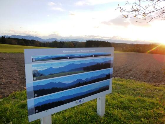Beeindruckendes Alpenpanorama vom Salzkammergut bis zum Großen Traithen – besonders zu empfehlen sind die zwei Aussichtspunkte mit je einer Panoramaschautafel zu den Berggipfeln.