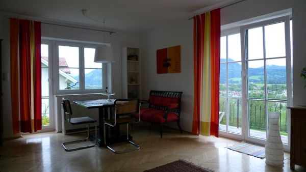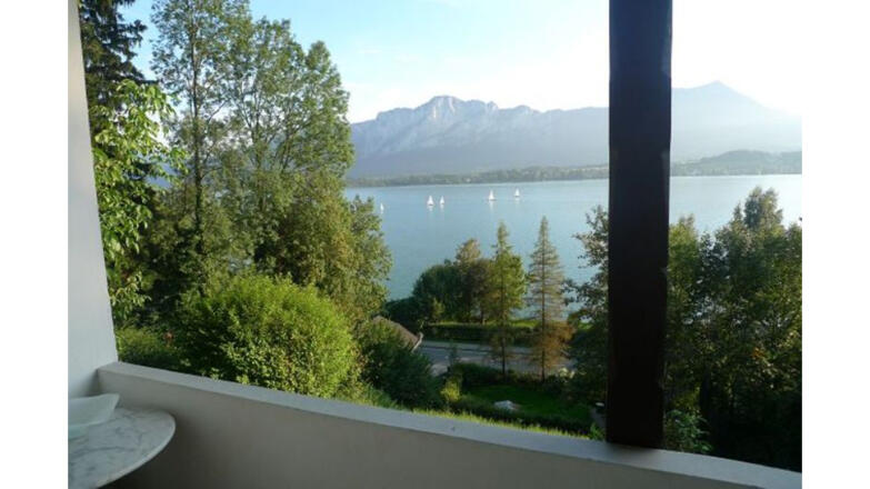 Salzkammergutvilla mit traumhaftem Blick auf den Mondsee, auf einer kleinen Anhöhe gelegen, nur durch die Uferstraße vom See getrennt. 7 Gehminuten zum Ortszentrum.