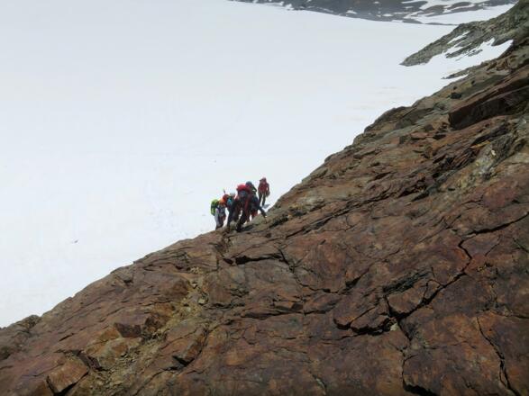 Hier stehen uns zwei Alternativen für der weiteren Abstieg zum Taschachhaus zur Auswahl: (1) Abstieg westlich ins Sexegertental (siehe Trackaufzeichnung) über den zunächst mäßig steilen Gletscher bis auf ca. 2800 m eine Steilstufe beginnt, die aufgrund des Gletscherrückgangs in den letzten Jahren immer problematischer wurde (Blankeis, Steinschlag). Im Juli 2015 wurde ein versicherter Steig eingerichtet, der diesen Abstieg wesentlich erleichtern soll. Der neue, mit Klettersteig-Materialien versicherte Weg, verläuft rechts (im Sinne des Abstiegs) an den Felsen. Anschließend auf markiertem Steig unschwierig zurück zur Hütte.