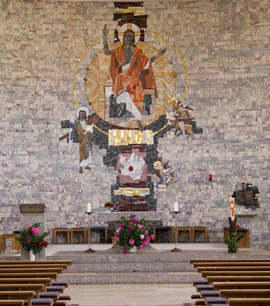 Wer den Innenraum betritt, wird überrascht sein von seiner großzügigen Weite. Ein Natursteinmosaik mit Steinen aus aller Welt, entworfen vom Münchener Kunstmaler Willibald Bierl und 1971 ausgeführt, bestimmt mit der bemerkenswerten Bildkomposition der Majestas Domini an der Chorrückwand den Raumeindruck. Vom gleichen Künstler stammen auch die wertvollen, großformatigen Glasfenster der Kirche. Als Besonderheit sei auf die Kreuzwegdarstellung des Malers Leo von Welden (1899-1967) verwiesen, der lange in Feilnbach wohnte.