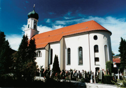 Als Vorläuferin hatte die Oberammergauer Kirche vermutlich einen Holzbau. Zu Beginn des 12. Jh. wurde sie in eine romanische Steinkirche umgebaut. Da die bis dahin gotische Kirche sehr stark beschädigt war, beschlossen und planten die Augustiner Chorherren aus dem Raum Rottenbuch 1732 einen Neubau. Ab 1736 erfolgte ein Neubau. Josef Schmuzer leitete den Neubau des Rokokojuwels, sein Sohn Franz Xaver war der Stuckateur. Die Decken und Wandfresken stammen vom großen Matthäus Günther, geboren 1705 auf einem Einödhof am nordseitigen Abhang des Hohen Peißenbergs.