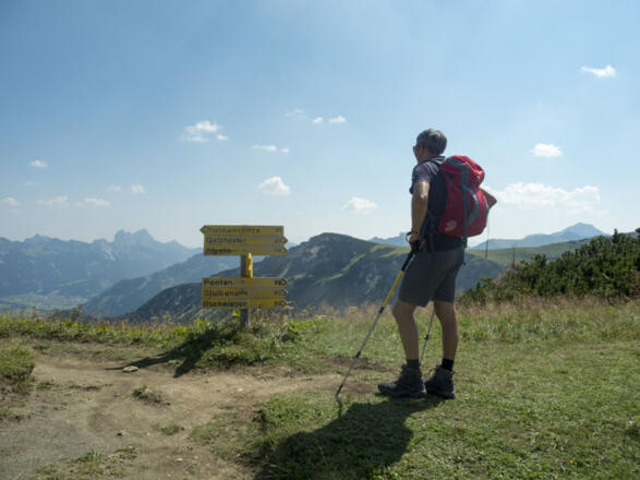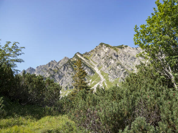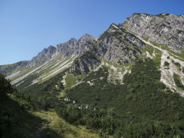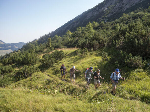 Wanderung am Bergpfad. Hier sind wenige Wanderer unterwegs. Schöne Alpenblumen und oft Gämse zu sehen.