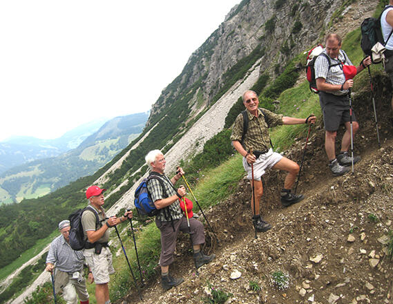 Autofahrt nach Zöblen - Liftparkplatz. Über die Vilsbrücke, dann den Bergpfad durch Wiesen und Waldstücke hoch ins Pontental. Der Pfad geht dann über ein großes Schotterfeld und dann noch eine oft feuchte Bergwiese hoch zum Zirelseck. Bei der Bergwachthütte machen wir Pause und genießen den Ausblick zum Geißhorn und ins Älpletal. Der Abstieg zum Älple ist steil und schottrig. Nach der Brotzeit Abstieg über den Höfersee nach Zöblen.