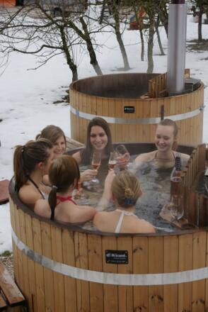 Direkt beim Haus befindet sich ein großer Garten mit Spielplatz und Schaffelbadewanne im Obstgarten, sowie unser Blockhaus, in der wir Edelbrände herstellen. Natürlich können unsere Gäste unsere Bundes- und Landessiegerschnäpse verkosten.
