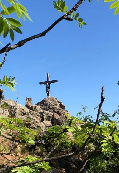 Die erstmals 1885 erbaute Kapelle erhebt sich auf einem Felsvorsprung über dem Rachelsee.