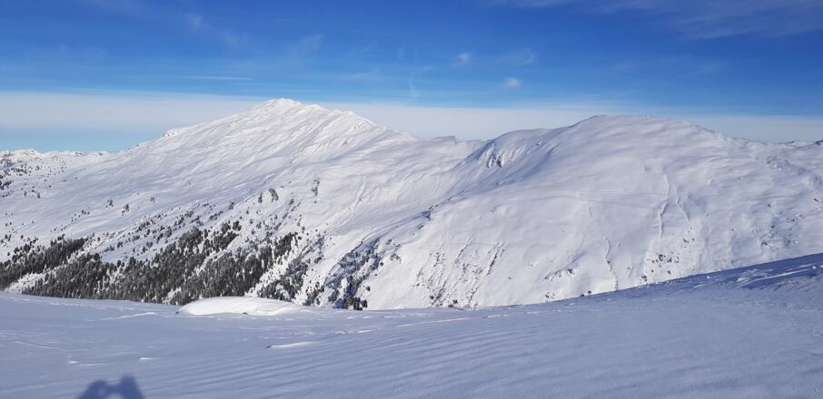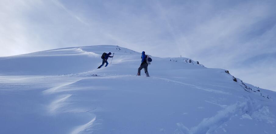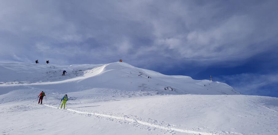 Abfahrt: Wie Aufstieg, entweder über den Nordostgat zurück oder - schöner - vom Gipfel kurz nach Norden in eine Einsattelung und dann rechts bzw. östlich hinunter. Zu beachten ist gleich der erste Hang (ca. 50 Hm) vom Kamm hinunter, da er im Lee liegt und kurz über 35° steil ist.