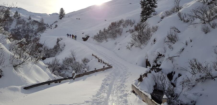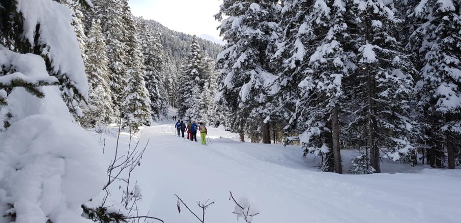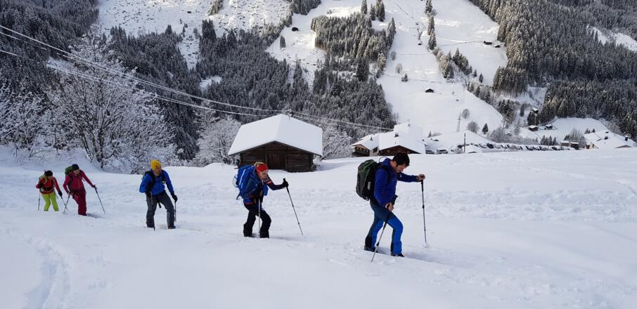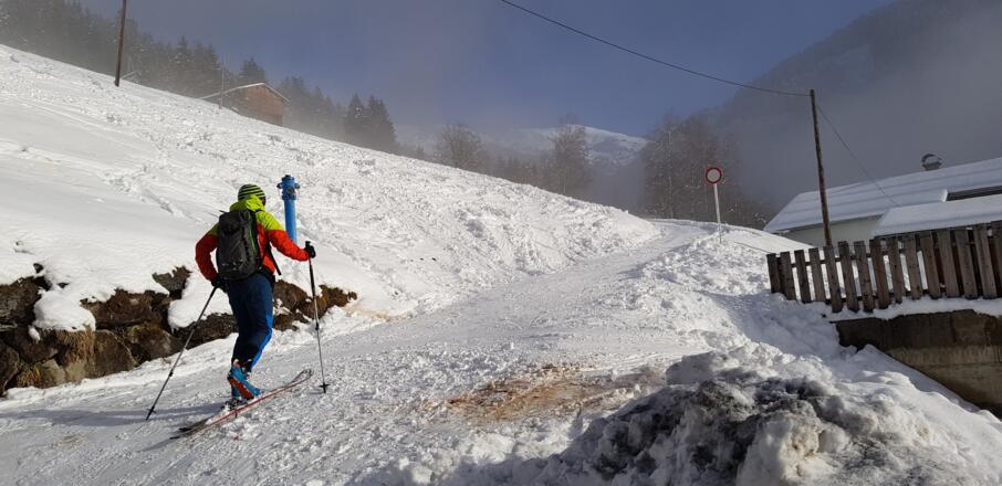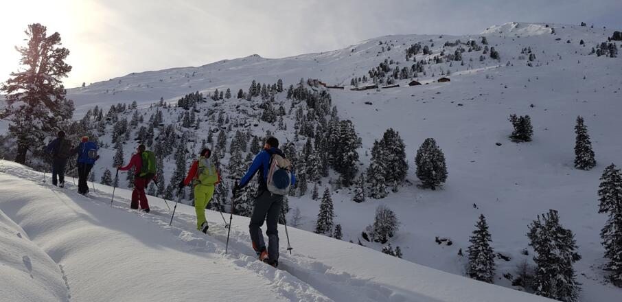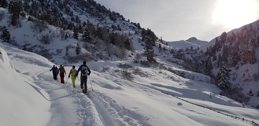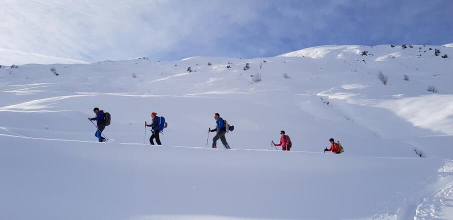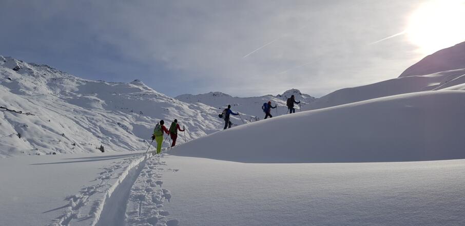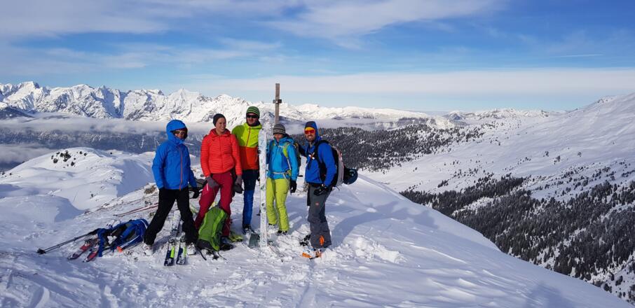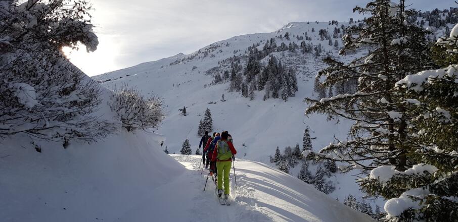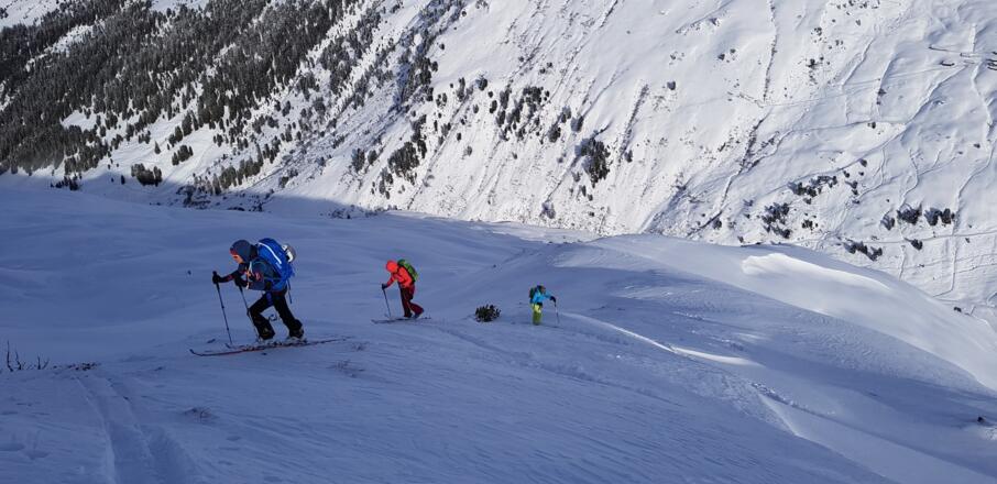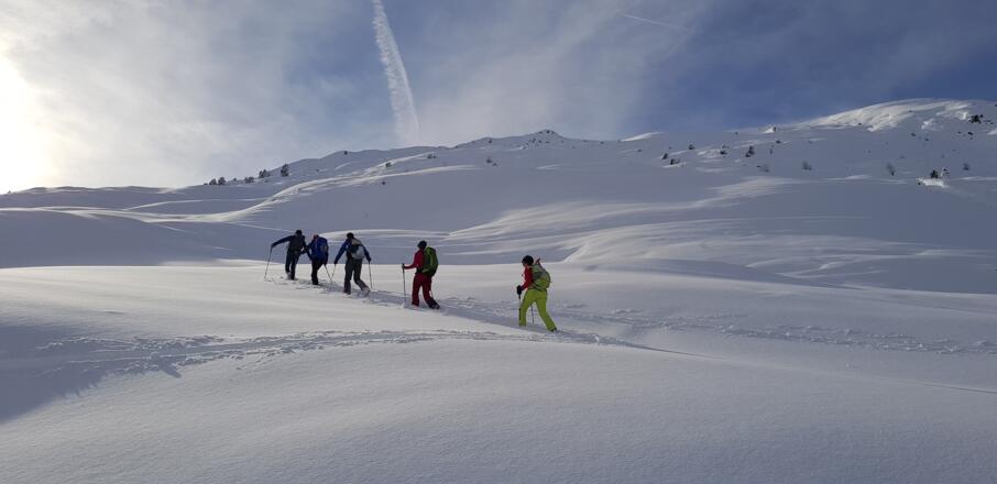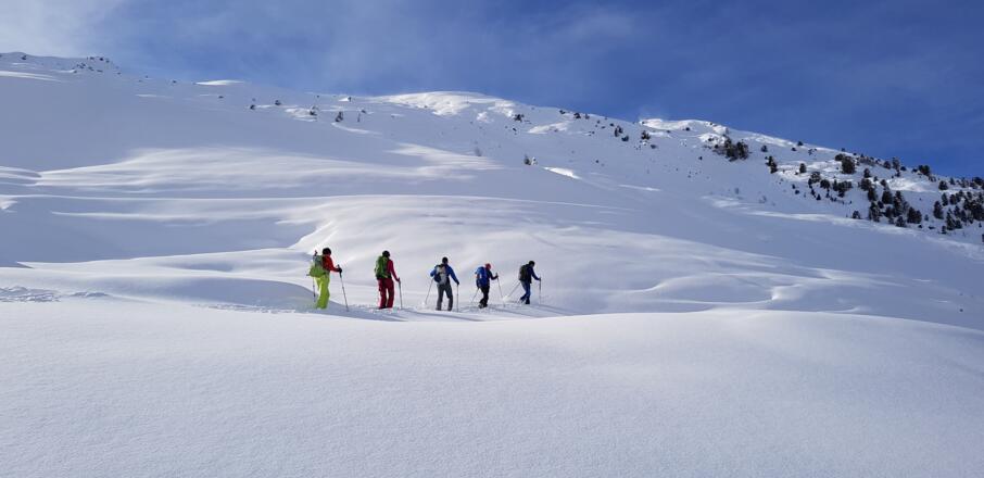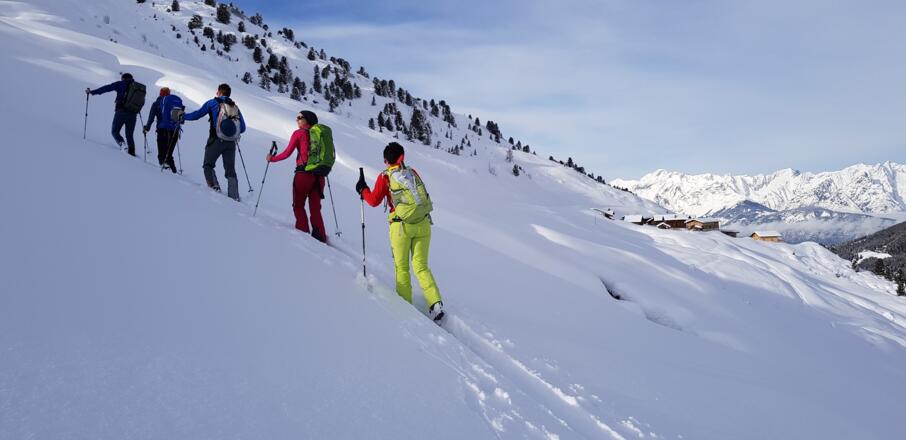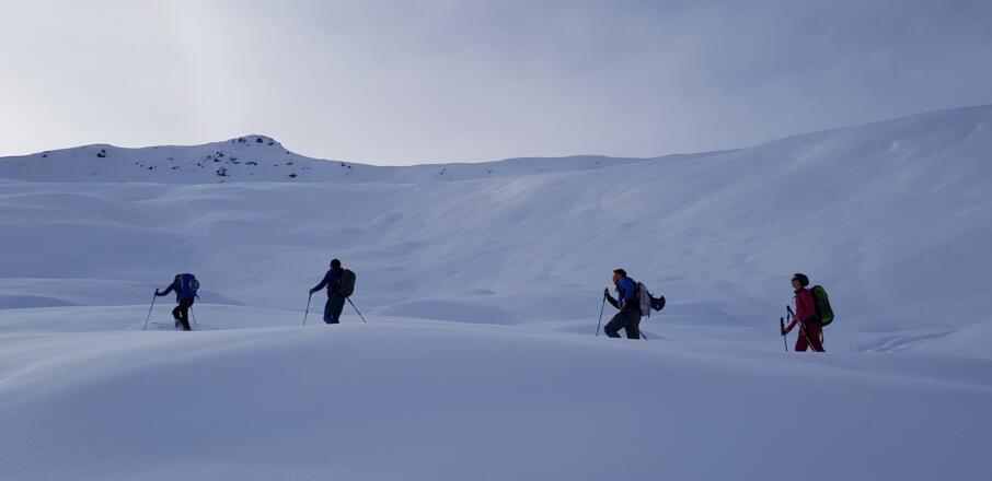 Skitourenausrüstung inkl. Notfallausrüstung: LVS, Schaufel, Sonde, Handy, Erste-Hilfe-Paket, Biwaksack.