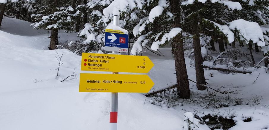 Aufstieg: Vom Gasthof Innerst kurz über die Wiese (oder die Forststraße) hinauf, dann rechts auf dem Forstweg der Beschilderung "Nurpenstal" folgen bis zur Stallenalm. Weiter auf dem Forstweg taleinwärts und über die Brücke auf die westliche Talseite. Nun über die freien Hänge und in einiger Entfernung links an der Unteren Nurpensalm vorbei aufwärts, dabei immer wieder den Forstweg kreuzend. Oben, ab ca. 2100 m, je nach Verhältnissen direkt auf den Kamm rechts des Gipfels (kurzer Steilhang im Lee, ca. 38° steil) oder nach links hinaus auf den Nordostgrat (lawinentechnisch sicherer) und über diesen zum Gipfel.