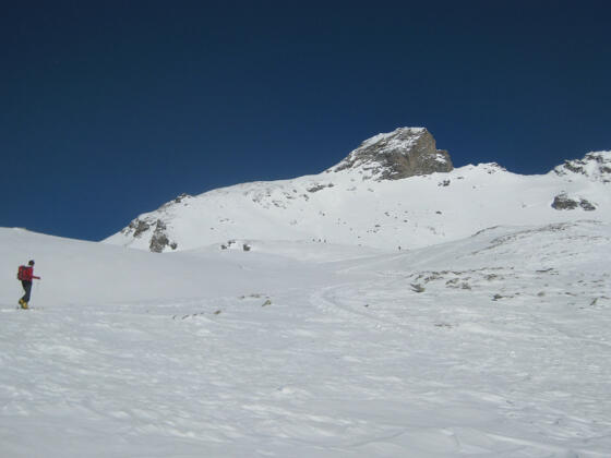 Schöne mittelsteile Südhangtour (Firntour) mit langem schattigen Zustieg. Steiles Gipfelfinale.