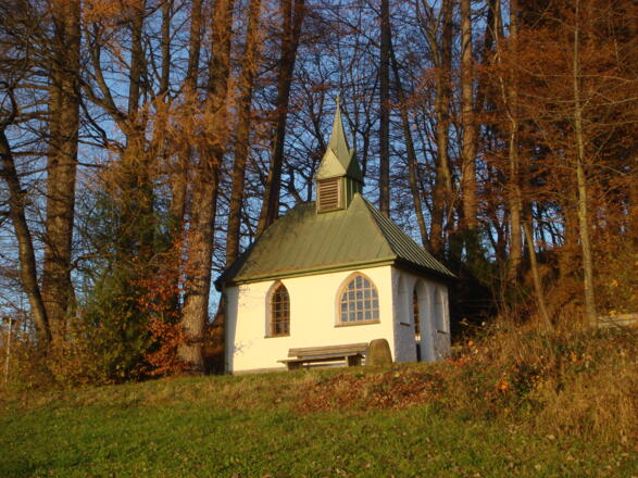 Nach einer kurzen Besichtigung der Wallfahrtskirche führt Sie die Route zur gegenüberliegenden Straßenseite, wo Sie ein Kreuzweg der verstorbenen Eggstätter Künstlerin Christine Stadler hinunter ins Eichental geleitet. Wenn Sie sich an der ersten Weggabelung nach rechts wenden, stoßen Sie kurzerhand auf die Prienbrücke. Bereits vor der Brücke fällt der Blick auf eine Art Naturhöhle, die zeitweise als Luftschutzstollen gedeutet wurde. Auf der linken Seite können Sie auch die ehemalige Aumühle sehen, deren Ostseite mit Freskomalereien von Franz Xaver Tiefenbrunner verziert wurde. Flussaufwärts geht es weiter bis zum malerischen und sehenswerten Elektrizitätswerk der Marktgemeinde Prien. Ein kleiner Bach führt uns im Anschluss hinauf zur ehemaligen Grabmühle und zum südlichen Ortsausgang von Siggenham. Dort ist an der Staatsstraße eine gut restaurierte Martersäule zu sehen, die an den hier verunglückten Freiherrn Wilhelm von Schurff erinnert. Nach den letzten Häusern Siggenhams biegen Sie links auf einen kleinen Feldweg ein und wandern querfeldein in nordöstlicher Richtung hinauf zu einem markanten Hügel. Dort finden Sie einen Gedenkstein für Rolf und Kurt Scheler, die während des Ersten Weltkrieges tödlich verwundet wurden. Die Gedenkstätte stammt vermutlich von ihrem Vater, Generalmajor Scheler, der dank einer großzügigen Grundstückspende den Bau der evengelischen Christuskirche ermöglichte. Dessen ehemaliges Landhaus erreichen wir, wenn wir den Hügel in östlicher Richtung wieder hinuntergehen. Dabei ergibt sich auch ein herrlicher Blick auf Prien und die Chiemgauer Berge. Danach geht es hinauf nach Pinswang, wo eines der bedeutensten Anwesens des ganzen Chiemgaus steht, der frühere Salzburger Maierhof. Bereits im Jahr 927 residierte dort ein Zinsprobst, einer der einflussreichen erzbischöflichen Güterverwalter, die später Maier genannt wurden. Es ist daher gut denkbar, dass die Kirche St. Salvator in seiner ursprünglichen Form die Maierhofkirche von Pinswang war. Als nächstes wird die durchaus sehenswerte Kriegergedächtniskapelle oberhalb des Ortes angesteuert. Ein paar Meter weiter befindet sich der Wasserspeicher von Prien. Durch einen kleinen Wald erreichen Sie berab einen kleinen Bachlauf, an dem Ihnen ein Bildstöckl Konrad Hubers den weiteren Weg weist. Sie sollten sich an dieser Stelle nicht von dem tollem Ausblick auf Prien ablenken lassen, der bereits viele Male zu Werken inspirierte, sondern die Augen lieber nach vorne richten, wo einigen Grabfunden zufolge, wohl eine noch nahezu unerforschte Römersiedlung liegt. Nachdem Sie erneut die Staatsstraße überquert haben, führt der Weg wieder ins Eichental. Über den Kreuzweg von Christine Stadler gelangen Sie nach rund 2 Stunden wieder zurück zum Ausgangspunkt.
