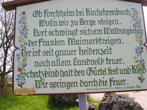 Herrliche Wanderung, vor allem zur Zeit der Kirschenblüte oder im Herbst, von Kirchehrenbach hoch zur Ehrenbürg (das Walberla) mit der St. Walburgiskapelle, auf der Hochebene zum Rodenstein und dann hinab nach Schlaifhausen. Von dort zur St. Moritzkapelle und weiter nach Leutenbach. Der Rückweg führt wieder über die Ehrenbürg zurück nach Kirchehrenbach.