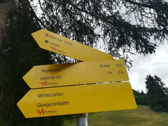 Mit der Glungezerbahn zur Mittelstation. Westlich unterhalb vom Gasthaus Halsmarter bei einer kleinen Hütte der Beschilderung "Voldertalhütte-Steinkasern Nr. 22A folgen bis zum Waldwegende. Weiter auf einem schmalen Bergweg, bis man in einen Forstweg einmündet. Hinab folgend und weiter zur Voldertalhütte.