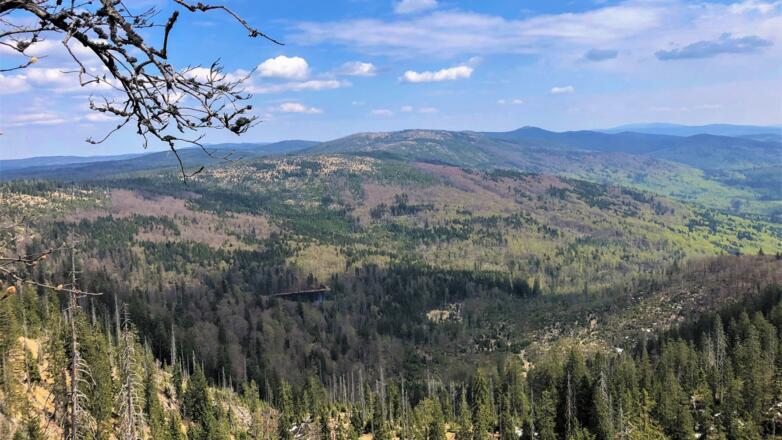 Am P+R Spiegelau steigen wir in den Igelbus ein und fahren bis zur Haltestelle Gfäll (955 m ü. NN). Dort angekommen folgen wir der Markierung ,Auerhahn' in Richtung Rachel. Kurz hinter dem Wartehäuschen steigt der Schotterweg steil an. Es folgt ein langer, stetiger Aufstieg durch Bergmischwald, der später in Hochlagenfichtenwald übergeht. Nach ca. 1¼ Stunden erreichen wir das Waldschmidthaus (1360 m ü. NN, im Sommer bewirtschaftet). Hier lohnt sich ein kleiner Abstecher nach rechts zum Seeblick. Der etwa 50 m lange Steig führt uns an einen kleinen Aussichtspunkt mit schönem Blick über den Rachelsee und die Höhenzüge des Böhmerwaldes. Zurück am Waldschmidthaus folgen wir weiter dem ,Auerhahn' und erklimmen die letzten einhundert Höhenmeter über Felsstufen, bis wir schließlich am Gipfel des Großen Rachel ankommen (1453 m ü. NN).