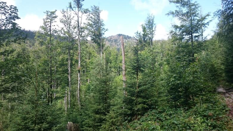 Nun befinden wir uns schon auf dem letzten Stück der Wanderung und es geht nun bergab durch den entstehenden Urwald im Nationalpark. Ab und zu bieten sich schöne Ausblicke. Nach etwa zwei Kilometern erreichen wir wieder die Racheldiensthütte und können uns mit regionalen Spezialitäten stärken. Für die Kinder gibt es einen Spielplatz.