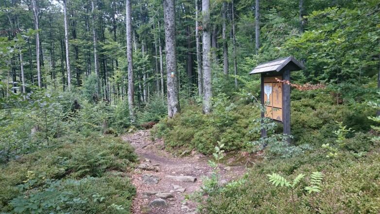 An der Bushaltestelle Racheldiensthütte beginnen wir unsere Wanderung, indem wir der Beschilderung zur Racheldiensthütte folgen und dem Pfad links vom Wartehäuschen ca. 200 Meter bergauf folgen.