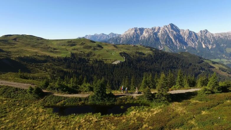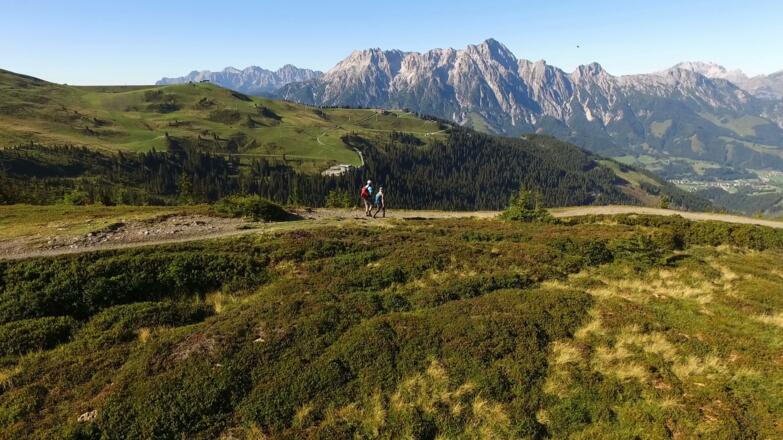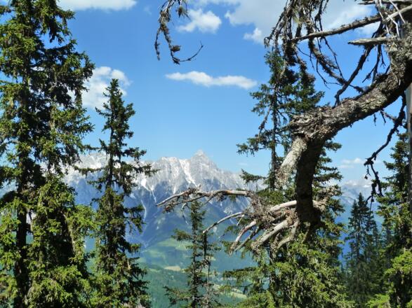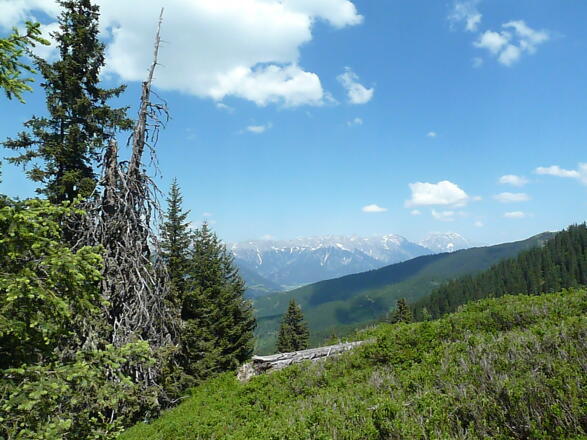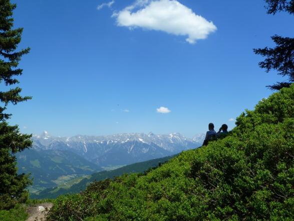Unterwegs hat man ein herrliches Panorama mit den Hohen Tauern mit Glockner und Venediger und im Süden den Kalkalpen mit dem Steinernen Meer, Watzmann, Hochkönig, Loferer und Leoganger Steinberge im Norden.