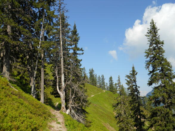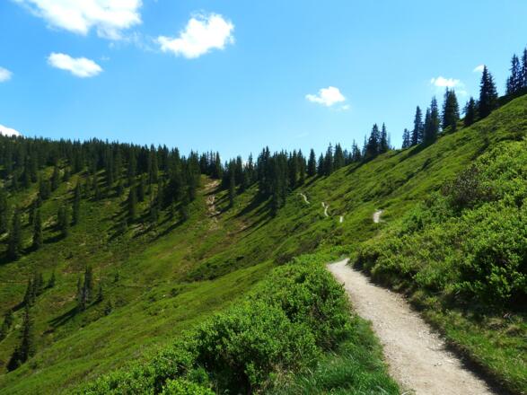 und dem schmalen Weg entlang auf der rechten Seite des Bergkammes bis zur Grünen Böden Hütte.