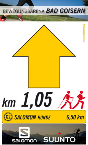 Auch für geübte Sportler stellt die gelbe Salomon Runde eine Herausforderung dar. Auf großteils Schotter beginnt man mit Runde 1 über die Brücke, entlang der Traun am Soleweg bevor man sich bei km 1,05 durch den Wald Richtung Laufen bewegt, bei km 3,3 Anbindung zur Bad Ischler Bewegungsarena. Bei km 3,5 Traun queren und flußaufwärts wieder zurück zum Ausgangspunkt. Bei km 4,0 Beginn der 1 km langen Intervallstrecke.