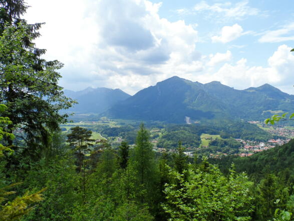Wir wandern zwischen zwei Häusern hindurch und folgen dem Weg am Waldrand in eine ausgedehnte Rechtskurve, bis wir den hellen Laubwald erreichen. Wir gehen in die Kehre und wandern dann rechts an der Felswand weiter, oberhalb derer sich die Burg befindet, entlang (in Richtung Staudacher Alm).