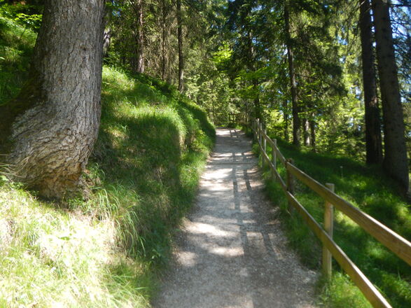 Die neunte Etappe des SalzAlpenSteigs vom Bergsteigerdorf Ramsau bis zum Königssee hat ihren Startpunkt bei der Gemeindeverwaltung/Tourist-Information Ramsau. Zuerst Richtung Westen entlang der Hauptstraße dem Verlauf der Ramsauer Ache folgend. Vor der Kirche biegen wir rechts in den Schluchtweg hinein. Der Weg führt uns stetig bergauf, bis wir nach ca. 250 Höhenmeter das "Zipfhäusl" erreichen. Hinter dem Zipfhäusl biegen wir rechts in den Wald ab und wandern Richtung Gerstreit weiter. Wenig später kommen wir an eine Brücke, die über eine Wasserfall führt. Auf dem Weg, auf dem früher eine Vielzahl an Soleleitungen verliefen und zum Teil noch immer verlaufen, erreichen wir das Gasthaus „Gerstreit“, dessen Gastgarten wir durchqueren und dem Soleleitungsweg weiter in den Wald hinein folgen. In einer scharfen Rechtskurve überqueren wir den Landtalgraben und wandern am Fuße des Söldenköpfls (1022m) entlang bis zum Bachmanngraben, immer entlang des Soleleitungsweges weiter. An einer Weggabelung zweigen wir links ab, und verlassen den Soleleitungsweg um in Richtung Engedey weiterzuwandern. Wieder aus dem Wald kommend, wandern wir durch eine kleine Siedlung und gelangen so auf die Ramsauer Straße. Dort biegen wir rechts ab, zweigen aber nach nur wenigen Metern wieder links ab, und überqueren die Ramsauer Ache. Nach der Brücke halten wir uns rechts, wandern für kurze Zeit den Brandweg entlang und biegen nach den ersten beiden Häusern links ab. Auf einem Schotterweg gelangen wir erst in den Wald hinein und wandern dann über blühende Wiesen und durch kurze Waldabschnitte bis zum Wanderparkplatz Hammerstiel. Hier biegen wir halblinks in den Wald hinein ab. An einem kleinen Bach entlang, wandern wir nun immer weiter den Berg hinauf. Der Forstweg führt uns zu einer Gabelung, bei der wir uns links halten und somit einen kleinen Bach überqueren. In Serpentinen geht es nun im idyllischen Mischwald relativ steil bergauf, bis die Schotterstraße schließlich an der Grünsteinhütte endet. Hier lohnt sich ein kleiner Abstecher zum Gipfel des Grünsteins mit wunderschöner Aussicht über Tal und Berge. Unser Weg nach Schönau am Königssee geht nun rechts weiter und führt uns wieder talwärts. Auf diesem Teil der Strecke lohnt es sich, hin und wieder zum Grünstein hinüber zu blicken, denn an dessen Steilwand kann man meist viele Kletterer auf den verschiedenen Varianten des Klettersteiges beobachten. Der Wanderweg geht schließlich in einen Schotterweg, den Klingerweg über und führt uns direkt an der berühmten Königsseer Bob- und Rodelbahn vorbei. Nach der Rodelbahn gehen wir linkerhand am Waldrand entlang und erreichen nach wenigen Metern die Königsseer Ache, die wir überqueren.
