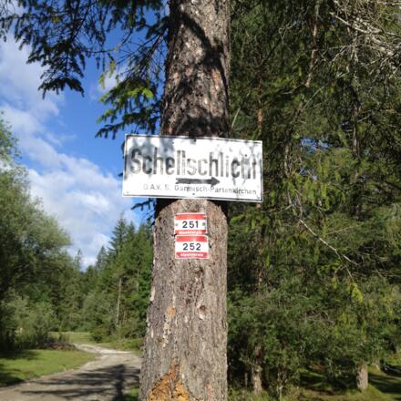Vom Bahnhof in Griesen gehen wir zunächst nach links, auf der Hauptstraße in Richtung Ehrwald, bis zum alten Grenzübergang. (Keine Sorge: in Griesen kann man sich nicht verlaufen!) Vor der Brücke dort biegen wir rechts in den Fahrweg ab, der am Grieß entlang in nordwestliche Richtung führt und haben schnell unser Ziel vor Augen, auch wenn wir noch längst nicht oben sind. Wir folgen dem Fahrweg etwa fünfzehn Minuten, bis zu einer Gabelung nach rechts, die mit „Schellschlicht“ ausgeschildert ist. Es geht zunächst eher gemächlich bergauf. Kurz vor der Klamm teilt sich dann der Weg und wir stehen vor der Entscheidung: machen wir den Aufstieg rechtsrum oder linksrum. Für viele erledigt sich die Entscheidung von selbst, denn der alte Weg (Nr. 252) rechtsrum, also ostwärts, ist nicht mehr so deutlich ausgeschildert wie ehedem und die Markierung am Baum kann man leicht übersehen. Die meisten Wanderer folgen deshalb kurzerhand dem klar erkennbaren Weg nach links (Nr. 251) über die Klamm und steigen westseitig auf und wieder ab. Wir tun’s nicht und schlagen uns nach rechts in die Büsche.