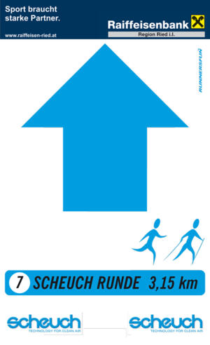 Die kurze, flache Scheuch Runde auf gemischtem Untergrund startet entgegen der Giga Sport Runde. Weiter nach Maierhof, Richtung Rieder Wald, trifft auf die Rieder Strecken und nach km 2 auf die Anbindungsstrecke zur Einstiegstafel der Firma Scheuch. Entgegen dem orangen Kurs wieder zurück zum Ausgangspunkt.