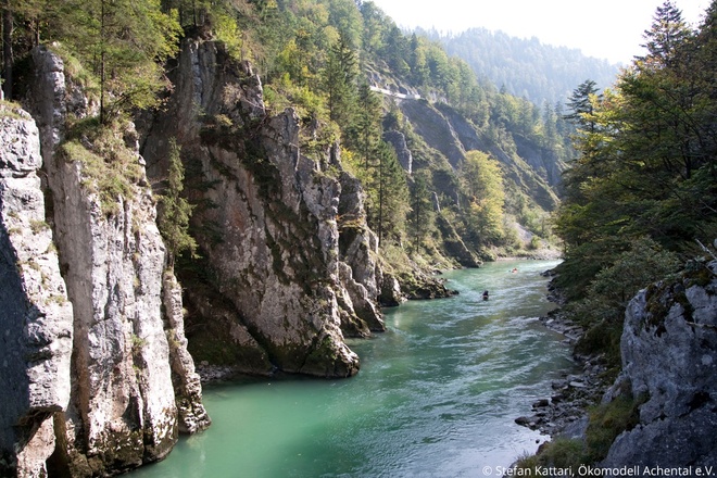 Das Highlight ist das Überqueren der Ache mit einer Hängebrücke. Von dort aus sieht man auch die Felsen der Entenlochklamm.