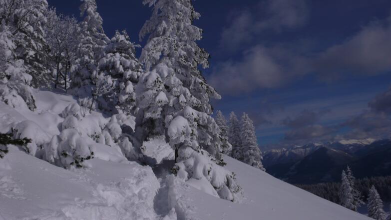 Einfache Schneeschuhtour durch einen märchenhaft verschneiten Felsenwald im Hochwinter hinauf zum Jochberg, von dem man mit einer Rundumsicht belohnt wird.