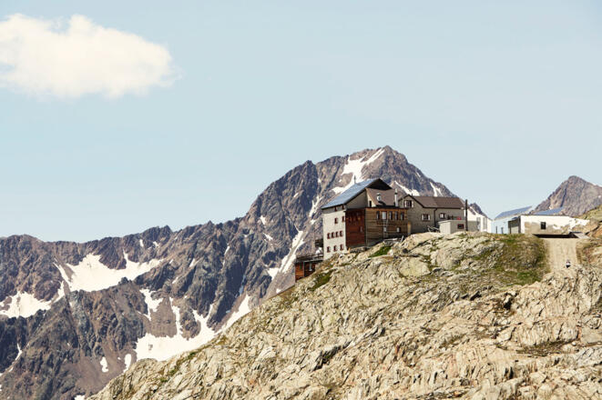 Von der Hütte führt ein steiler Steig hinunter zur Eisenbrücke, die über den Hintereisbach führt. Von dort in einigen Serpentinen hinauf und oberhalb des Hochjochferners mäßig ansteigend zum Schutzhaus Schöne Aussicht.