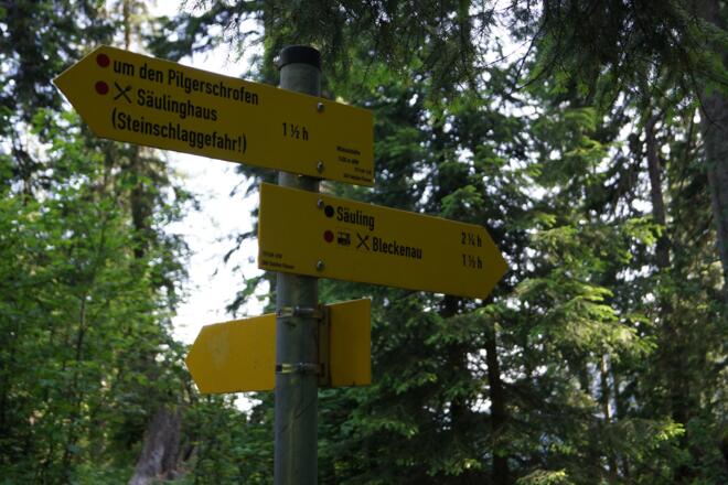 Die Kletterstellen sind mit Drahtseilen abgesichert. Achtung, vom Säulinghaus kommend Richtung Grenzübergang Deutschland ist die Wegeführung irreführend, achten Sie auf die Markierung!