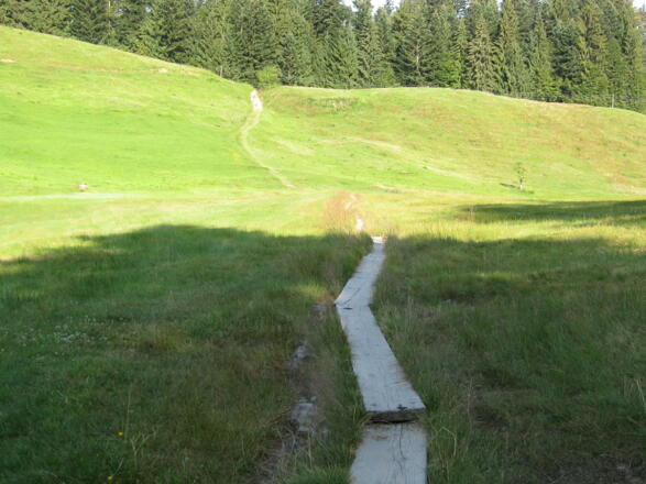 Wenn kein Schnee liegt, ist der Weg vom Bödele zum Lorenapass bei jedem Wetter ein Genuss. Nach einem leichten Abstieg und der gemütlichen Wanderung durch eine Moorlandschaft, folgt der flache Aufstieg zum Oberen Geißkopf. Dem nächsten leichten Aufstieg, bereits im kühlenden Wald, folgt ein etwas steilerer Abstieg. Dafür entlohnt anschließend das traumhafte Panorama auf der Breitentobelalpe mit Blick auf den Bodensee und über das Rheintal.