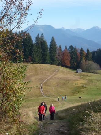 Etwas nordseitig des Bergkammes geht es weiter, vorerst durch den Wald bis zur Straße auf den Lorenapass. Somit hat man nun den Sagenwanderweg erreicht, der in seinem ganzen Verlauf von Alberschwende kommend, über Schwarzenberg nach Andelsbuch führt. Wir folgen nun diesem Weg über den Lorenapass, dann etwas bergab, auf einem Waldpfad zur ersten Ilga Quelle, dem sogenannten "Klockbrunnen" oder "Tafelbrunnen". Ein Stück des Weges muss nun wieder zurückgegangen werden, bevor Sie nach links an der Südseite des Bergkammes abbiegen und unsere Wanderung fortsetzen. Mit Blick auf den Mittelbregenzerwald und die Gebirgskette des Hinterbregenzerwaldes gelangen Sie über den Unteren Geißkopf wieder in die Nähe vom Oberen Geißkopf. Deutlich tiefer, als beim Hinweg, am Südhang des Ober Geißkopfs, erreichen Sie hier die zweite Ilga Quelle mit einer Legendentafel. Nach einem weiteren idyllischen Stück auf dem Sagenwanderweg verlassen Sie diesen bald wieder und wenden sich erst nach rechts und später nach links wieder Richtung Bödele.