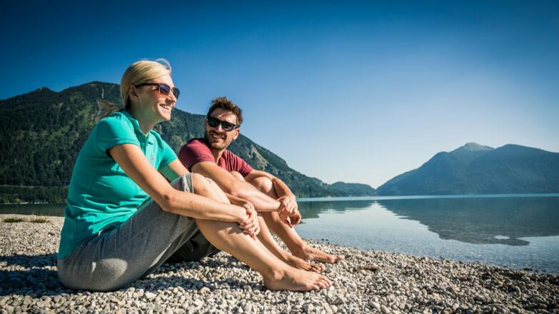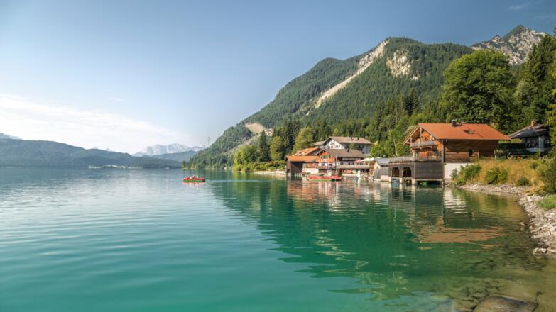 Der Walchensee mit seinem klaren Wasser liegt eingebettet zwischen den Bergen und lockt mit seinem Wassersportangebot Badegäste, Angler, Surfer und Segler, Kanufahrer und auch Taucher an.