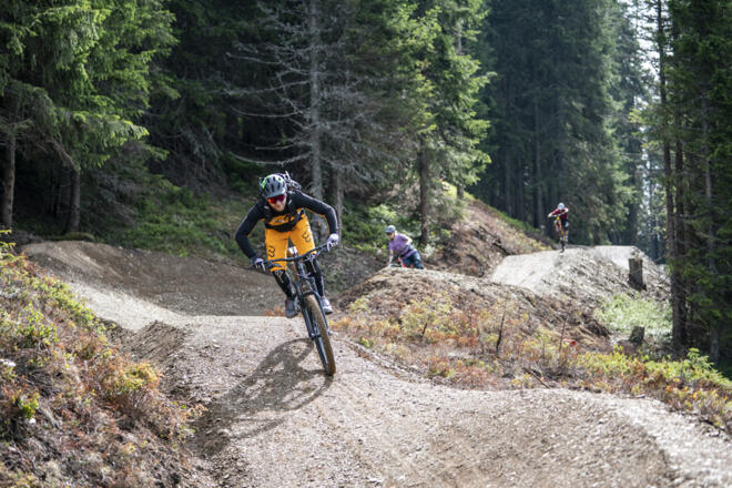 Gestartet wird an der Gipfelstation der Kohlmaisbahn. Am Ausgang einfach nach rechts - Direkt neben der Station befindet sich auch bereits der Einstieg in den Panorama-Trail, der sich super-flowig für versierte Biker, leicht zu befahren für Freeride-Neulinge präsentiert. Der Trail quert nach den ersten Metern über eine Forststraße - Tempo raus und Rücksichtnahme auf Wanderer und Kinder. Danach gehts weiter über weite Wiesen, gefolgt von einem kurzen Abstecher in den Wald und weiter über leichte Tables, Wellen und Anlieger direkt zur Panoramaalm. Ab hier geht es ein kurzes Stück auf der Forstsraße vorbei an der Panoramaalm Richtung Spielberghaus. Nach ca. 200m zweigt der neue Teil des Panorama-Trails ab. Dieser Abschnitt ist einfach zu befahren für Anfänger - Fortgeschrittene erleben dank der grandiosen Streckenführung und der vielen Tables sowie Wellen wahre Glücksmomente.