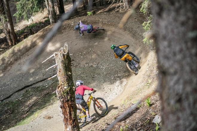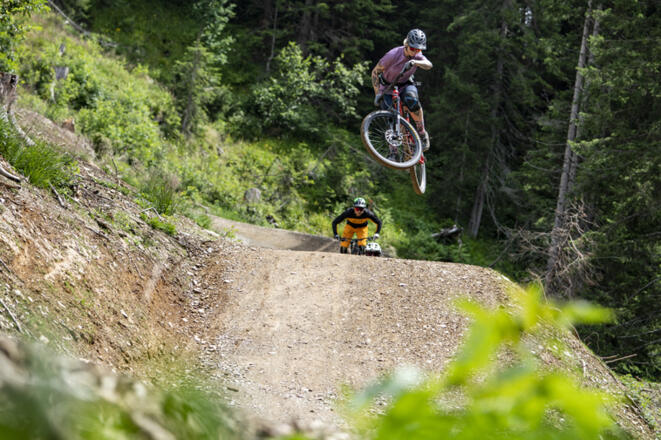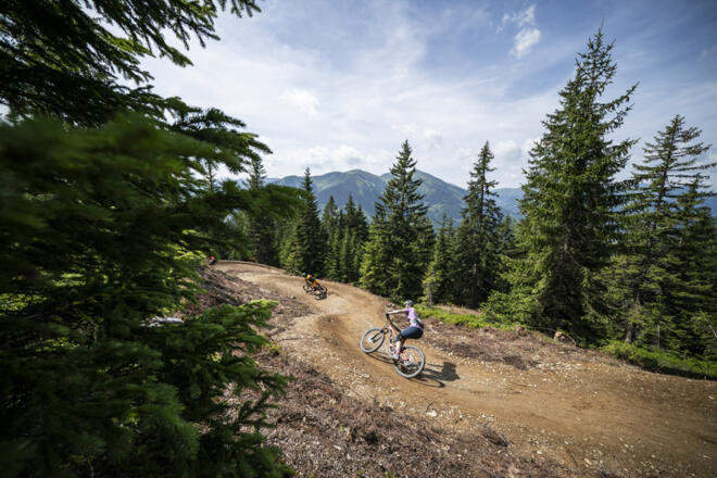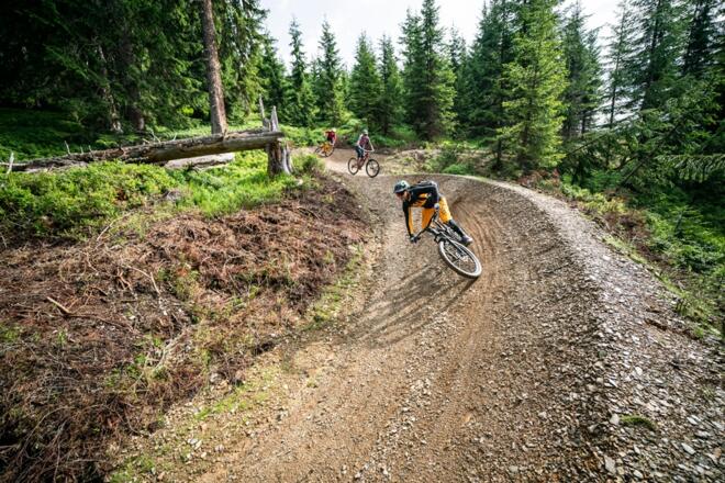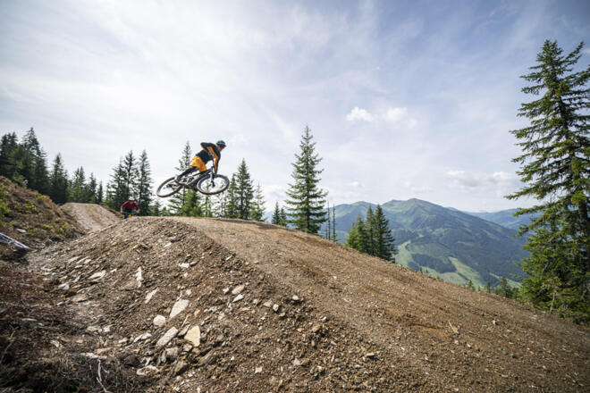 Spaßiger Singletrail mit einfachen Tables, Anliegern, Sprüngen und Wellen, die auch mit niedrigem Tempo befahren werden können. Dank seines Flows und dem grandiosen Ausblick auf Saalbach Hinterglemm kommen auch Soulrider auf ihre Kosten.