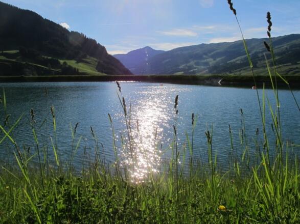 Die Bergstadl-Runde führt zuerst taleinwärts und biegt bei der Landesstraße nach links zur Zwölferkogelbahn ein.