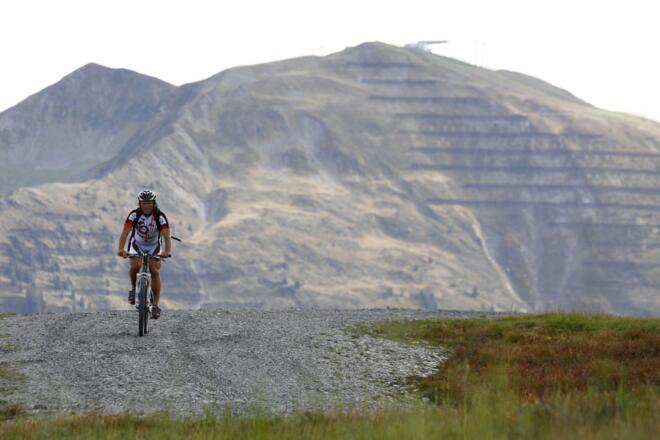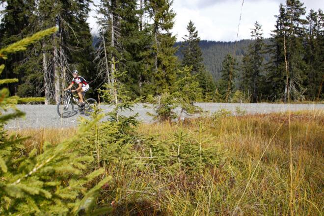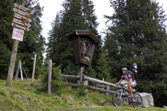 Vom Startpunkt beim Schattberg X-Press fährt man durchs Ortszentrum Richtung Norden und dann entlang des Spielbergbaches gerade hinauf bis knapp unters Spielberghaus. In einigen langgezogenen Serpentinen geht’s durch den Wald hinauf und man erreicht nach Querung der Skipiste den höchsten Punkt bei knapp 1.700 m Höhe. Kurz darauf erreicht man den Speicherteich unterhalb des Wetterkreuzes, der mit fantastischem Panoramablick zur Rast einlädt. Die Talfahrt erfolgt nun entweder über den Forstweg oder über den chilligen Wetterkreuz-Trail, beide Wege treffen dann knapp vor der Reiteralm wieder zusammen. Weiter geht’s zur Liftstation der Reiterkogelbahn und von dort in einigen Serpentinen über den Forstweg oder über Blue-Line oder Pro-Line hinunter nach Hinterglemm.