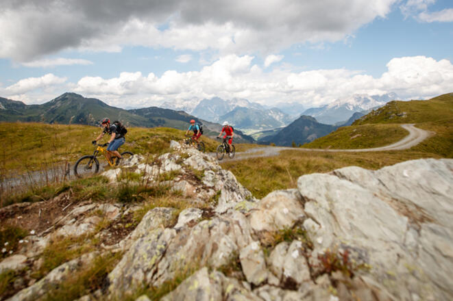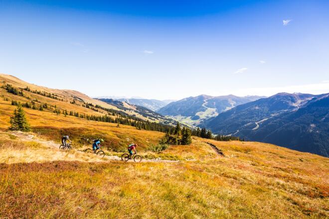 Um den Hochalm-Trail zu erreichen, legt man die ersten 500 Höhenmeter am besten mit der Reiterkogelbahn zurück. Danach geht’s vorbei an der Rosswaldhütte, hinauf Richtung Reichkendlkopf und auf der Forststraße am Grat entlang bis zur Bergstation der Spieleck 6er Sesselbahn. Hat man diesen Anstieg geschafft, wartet bereits die Belohnung: Eine schier endlose Abfahrt durch eine malerische Landschaft der Pinzgauer Grasberge mit einer äußerst attraktiven Streckenführung.