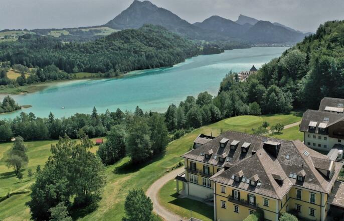 Das gemütliche moderne Salzkammergut Ambiente, lichtdurchflutet Räume und zahlreiche Terrassen prägen das elegante Traditionshaus. Es besteht aus 3 miteinander verbundenen Gebäuden, die perfekt in die Landschaft integriert sind und direkt am 9-Loch Golf- & Country Club Schloss Fuschl liegen.