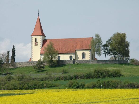 Eine der Urpfarreien der Gegend und eine der letzten Simultankirchen Bayerns in erhobener Lage mit Blick ins Ries. Wuchtiger annähernd quadratischer Westturm mit Zeltdach (um 1180). Langhaus wahrscheinlich aus dem 13. Jahrhundert, Chor Ende 15. Jahrhundert. Das gefasste Holzkruzifix aus dem frühen 13. Jahrhundert ist das älteste dieser Art im Ries.