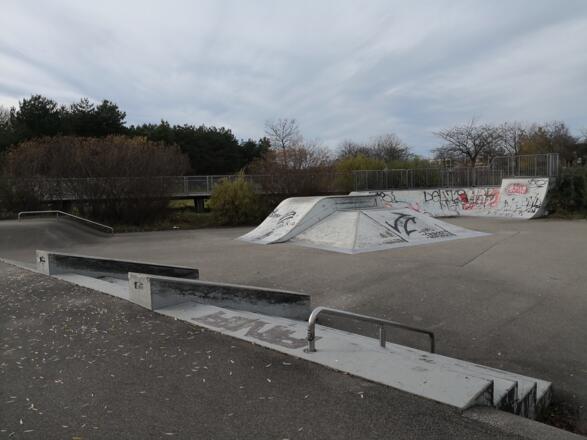 Der im Grünen liegende 1500 qm große Fertigbau bietet durch seine Vielzahl an Obstacles Fahrvergnügen für mehr als nur Skateboarder. Vor allem Scooter und BMX-Fahrer kommen aufgrund der Größe der Obstacles voll auf ihre Kosten. Auch das Skatepark Mobil fährt den Park regelmäßig von Mai bis Oktober an, um das Skaten allen Interessierten näherzubringen. Hier kann man sich Skateequipment kostenlos ausleihen und unter der Anleitung von Coaches das Fahren erlernen. Vor allem im Sommer lohnt es sich, vorbeizuschauen, da man nur einen fünfzehnminütigen Fußweg vom BUGA-See entfernt ist, um sich abzukühlen.