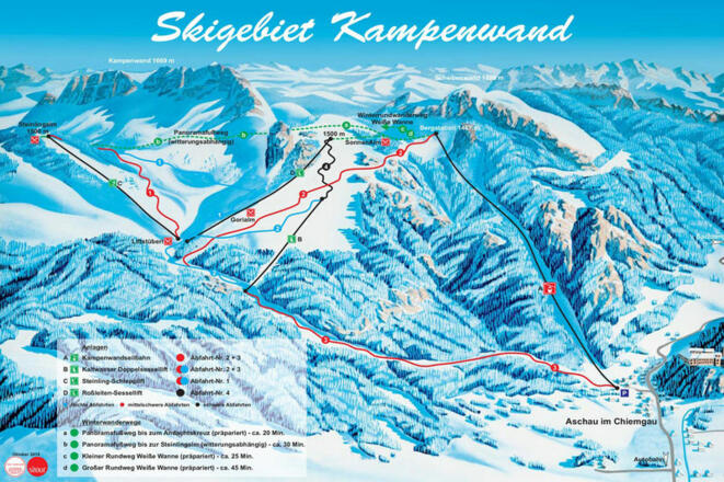 Das Skigebiet Kampenwand ist erreichbar über Aschau i.Chiemgau, vor Ort gibt es kostenlose Parkplätze. Der Bahnhof ist ca. 2 km entfernt, es gibt teilweise Busanschluss.