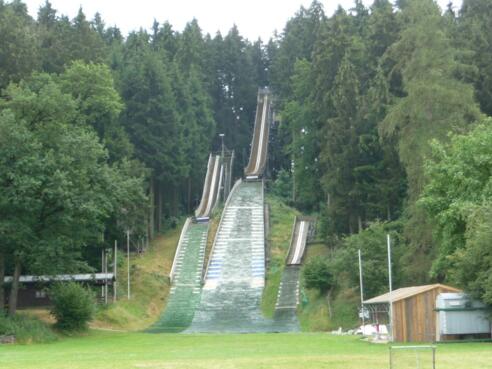 Skisprunganlage mit verschiedenen Sprungschanzen (11-Meter-Schanze, 22-Meter-Schanze und 40-Meter Schanze).