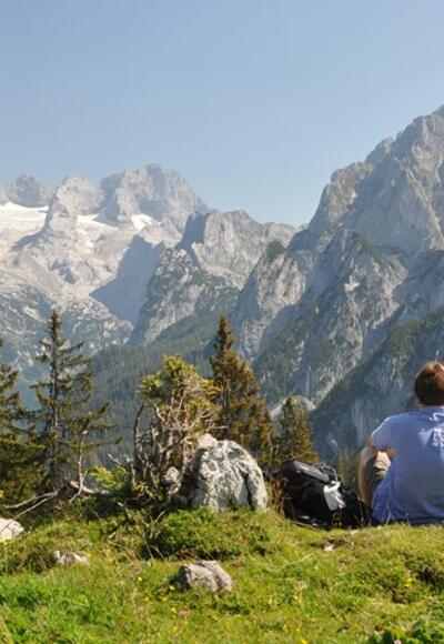 Eine gewaltige Bergwelt mit einer Sicht vom Dachstein über den Gosaukamm bis zum Großglockner tut sich direkt vor Ihren Augen auf.