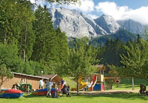 Neben der Eibseealm, am Fuß der Zugspitze, liegt der schöne Abenteuerspielplatz mit vielen Spielgeräten.