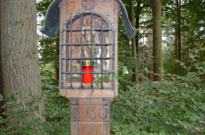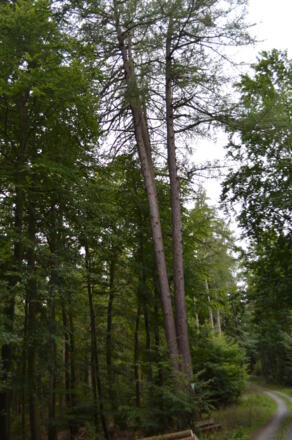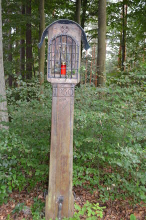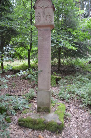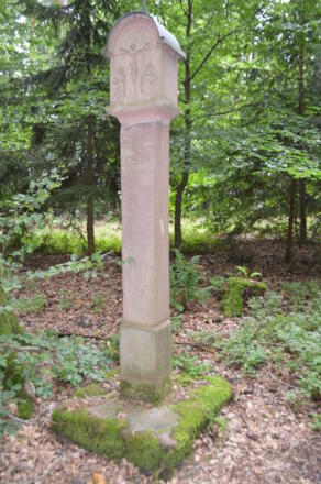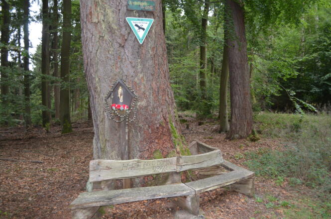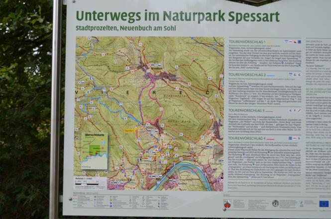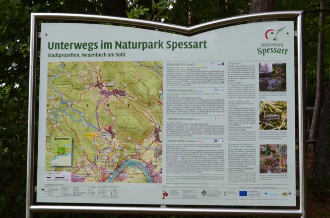 Ausgehend vom Wegweiser ‘‘Am Weiher‘‘ in Neuenbuch folgen wir dem Verlauf des Weges S1 nach links und erreichen nach ca. 1 km die Wanderhütte ‘‘am Sohl‘‘. Auf der dortigen Wandertafel des Naturparks Spessart ist unser weiterer Weg unter der Nr.2 beschrieben. Wir folgen daher dem Spessartweg 2 und treffen nach rund 2 km naturbelassenen Waldwegen den Fahrweg von Neuenbuch nach Wildensee, dem wir weiter bis zum Bildstock ‘‘Hölzern Bild‘‘ folgen. Weiter geht es zum Gedenkstein ‘‘Maßkanne‘‘. Dessen Geschichte lässt sich auf einer kleinen Tafel ablesen. Auf dem weiteren Weg treffen wir auf die ‘‘Dreifaltigkeitslärche‘‘, einem Naturdenkmal von beachtlicher Größe. Hier kreuzt auch der Fernwanderweg ‘‘Eselsweg‘‘, dem wir nun gemeinsam mit dem Spessartweg 2 bis zum Wegweiser ‘‘Jagdstock‘‘ folgen. Den beiden Zeichen weiter folgend finden wir nach ca. 600 Metern den Bildstock ‘‘Nonnenbild‘‘. Von da aus gehen wir zurück bis zum Wegweiser ‘‘Jagdstock‘‘ und biegen bei diesem nach rechts, auf den Weg S3 ab. Nach der ersten Linksbiegung belohnt uns ein grandioser Fernblick zum Hofthiergarten und dem dahinterliegendem Odenwald. Beim bald erreichten Wegweiser ‘‘Laffenbeuern‘‘ geht es weiter bergab, nun auch begleitet vom Wegzeichen S1. Beim Wegweiser ‘‘Buchspitze‘‘ folgen wir dem Weg S1, der uns über den ‘‘Sohl‘‘ zurück zum Ausgangspunkt in Neuenbuch leitet.