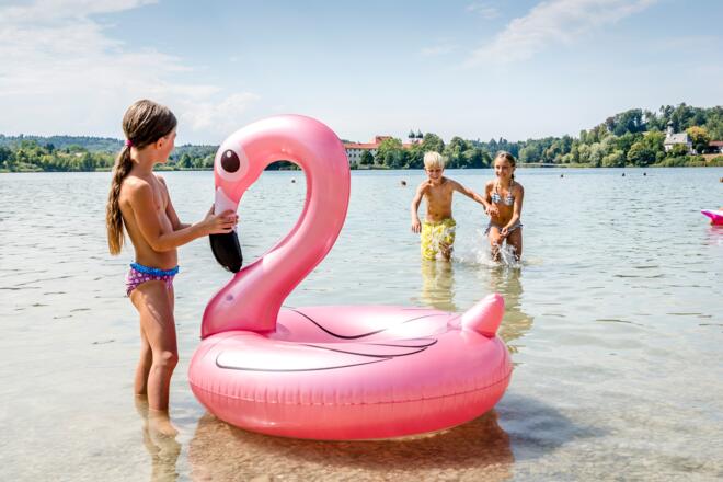 Das Strandbad Seeon, mit Blick auf das Kloster Seeon, verfügt über Duschen, Umkleidekabine, WC, Kinderspielplatz, Kinderrutsche ins flache Wasser, Steg und Badeinsel, sowie einen Kiosk. Parkplätze gegen Gebühr ebenfalls vorhanden.