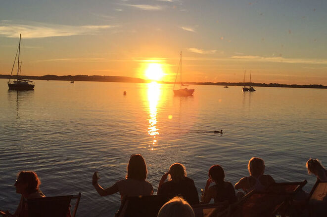 Die Beachbar ist bekannt für chillige Abende, mit einem sagenhaften Blick auf den Sonnenuntergang am gegenüberliegenden Chiemsee-Ufer.