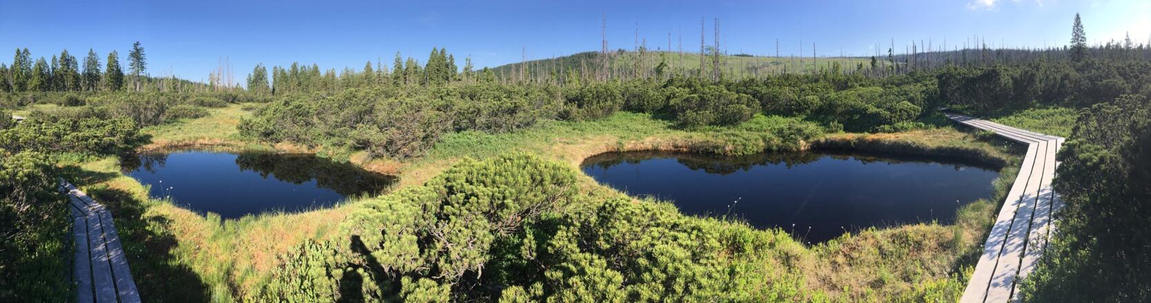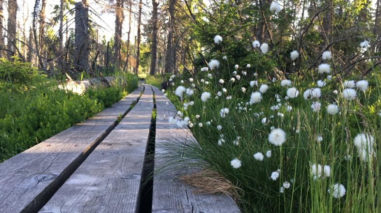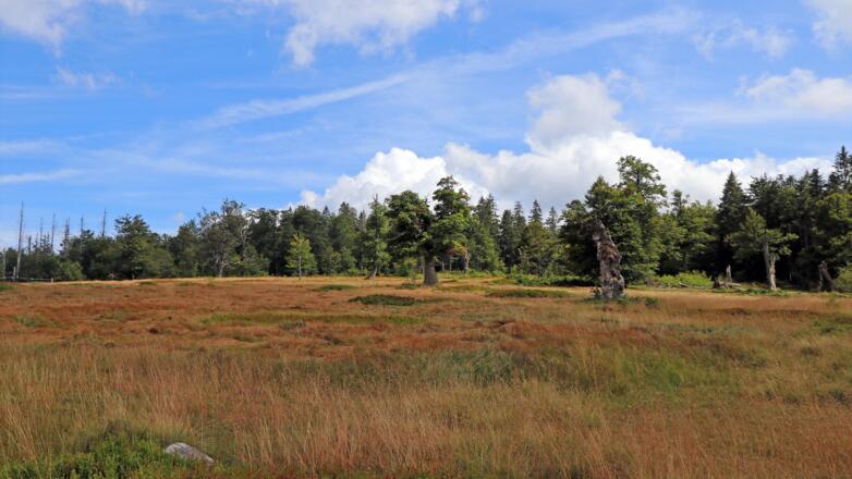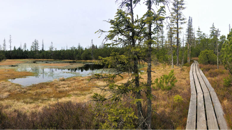 Nach einer kurzen Rast wandern wir weiter entlang der ,Pestwurz´, zunächst fast hangparallel mit leichtem Auf und Ab, bis der schmale Pfad auf einen Schotterweg trifft, dem wir wenige hundert Metern folgen und dann auf die Hirschbach-Schwelle treffen. Gleich danach zweigen wir wieder auf einen schmalen Pfad ab und folgen der ,Pestwurz´ zum Zwieselter Filz. Der größte Sattelhochmoorkomplex Deutschlands ist zum Schutz der sensiblen Vegetation und störanfälliger Tiere nur durch einen markierten Bohlenweg erschlossen und darf ansonsten nicht betreten werden.